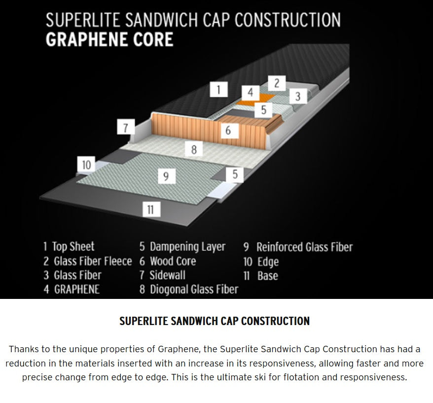 Head uses Graphene, the lightest, strongest material available for ski building. This allows the ski to be thinner, and lighter, and still offer excellent stability and edge hold. Developed from the most sophisticated materials known to man: the Super Light Sandwich Construction makes up one of the world’s lightest freeride skis by utilizing Graphene, two different carbon layers, as well as replacing the surface with a polyester fleece. The ultimate construction for a high performing freeride ski.