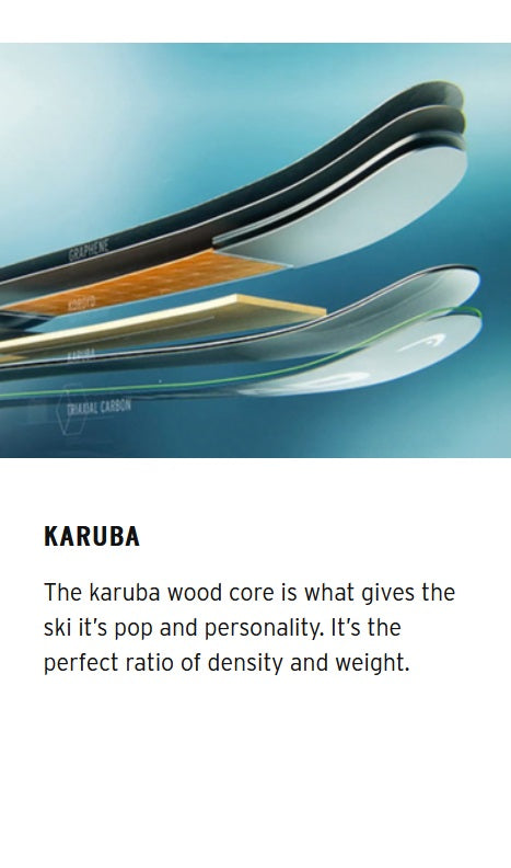 Kore 85 is engineered to reduce weight, without sacrificing performance. A combination of Karuba wood, reinforced with Graphene and multiple layers of carbon make this one of the most unique and sophisticated constructions on the market. The Kore 85 loves mixed snow conditions, and especially shines in afternoon bumps and crud.