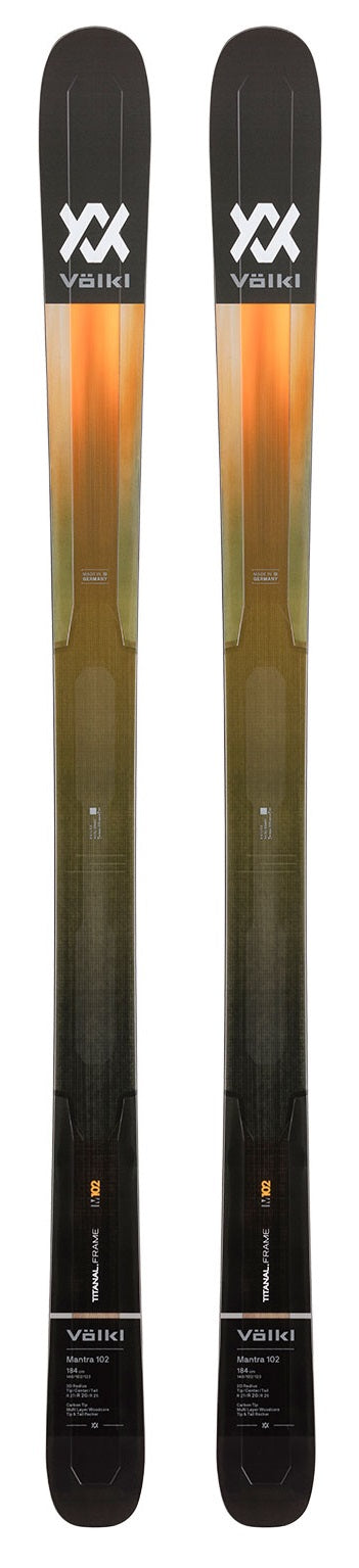 Volkl says "The Mantra 102 handles the days between storms with ease thanks to its new 3D Radius sidecut design, with three distinct radii that work together to allow an incredibly short turn on such a wide ski with no loss in float or stability. When it does start dumping the wider, 102mm chassis, Titanal Frame construction, and Tip and Tail Rocker design give you the float and maneuverability of a powder ski. This Western one ski quiver is sure to gain a huge following for this wider Mantra."