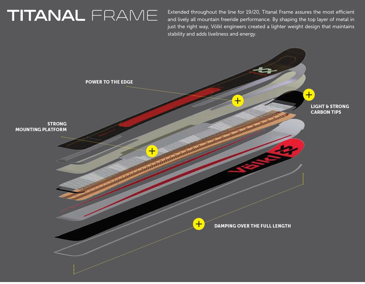 • Titanal frame construction removes metal from the center of the ski, allowing the ski to have a lighter, springier feel on the snow.  Dampening and edge hold are maintained, but the ski is simply easier to ski on.