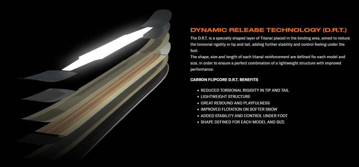 • DRT Titanal layer above the core is full width under the boot, but tapers to a narrower shape toward the tip and tail. More torsional stiffness where needed for power and stability, less where needed for float and forgiveness.