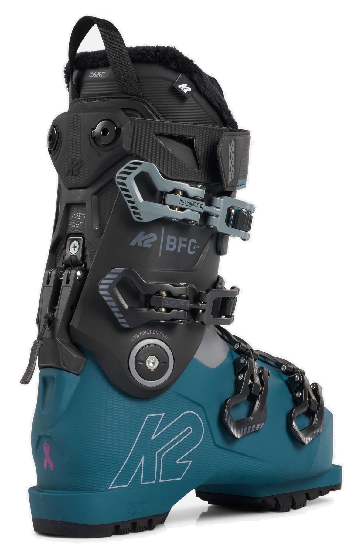 K2's BFC W 95 GW is a medium-flexing ski boot for lady skiers who demand comfort first and foremost, but still want a good performing boot that can ski anywhere on the mountain. It offers super easy hands-free entry, with dual molded, softer material on top of the lower shell. You’ll be in and out of your boots super quick and easy. The wider shell shape with 103mm last width, Cushfit Plus liner, a fully-heat-moldable shell, and a newly designed walk/Après Mode makes this a super friendly boot to spend all day in. BFC means Built For Comfort, and this boot delivers on that promise.