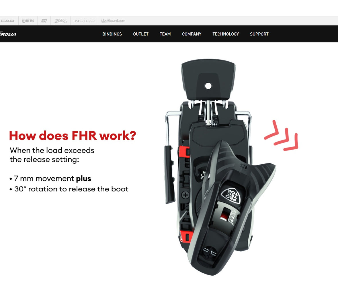 ♦ Advanced protection for knees with the Full Heel Release System built into the base of the heel unit, offering LATERAL release at the heel. This FHR system even has it own DIN release setting, allowing the skier to choose how easy it should release in a backward twisting fall.